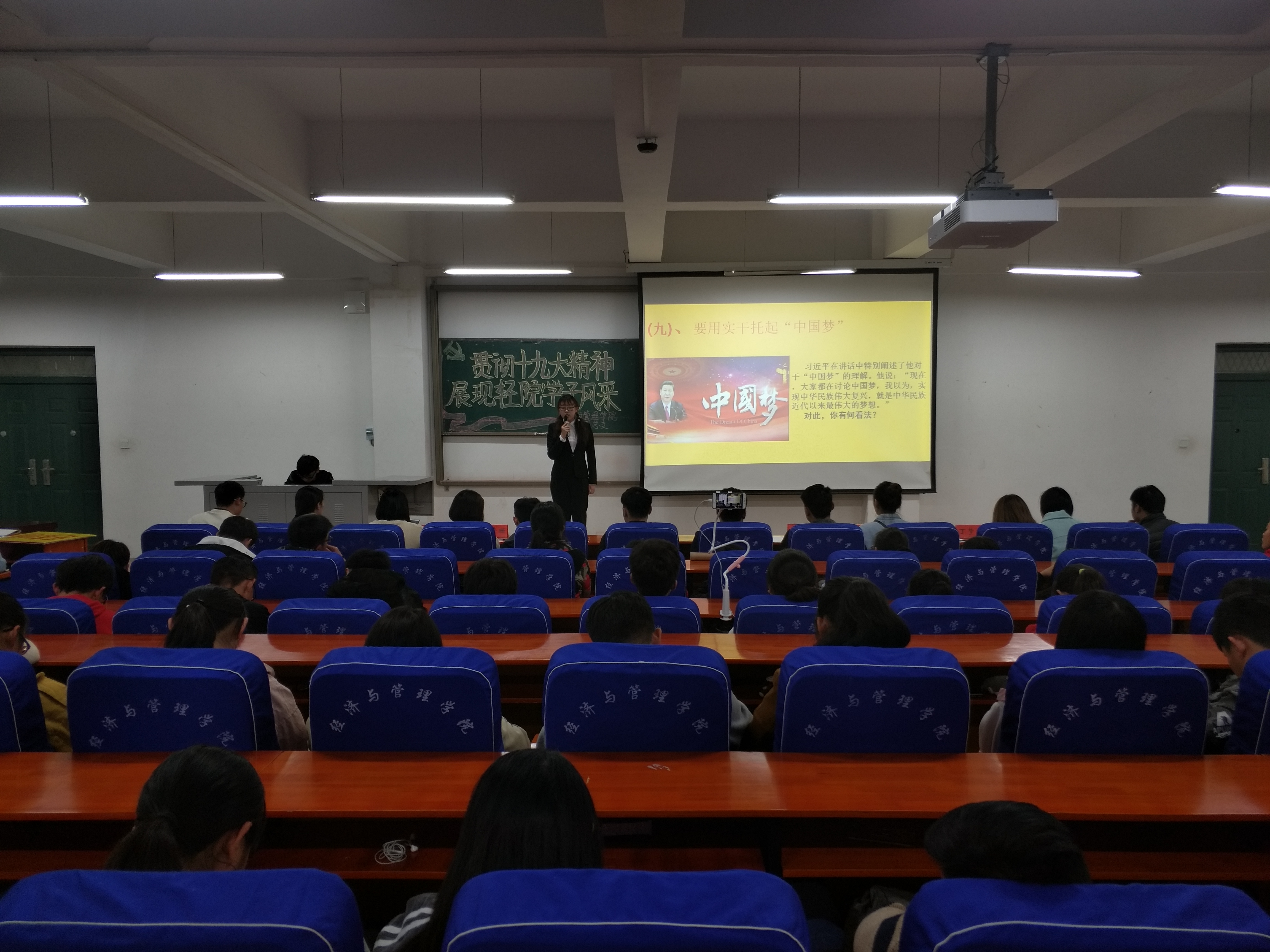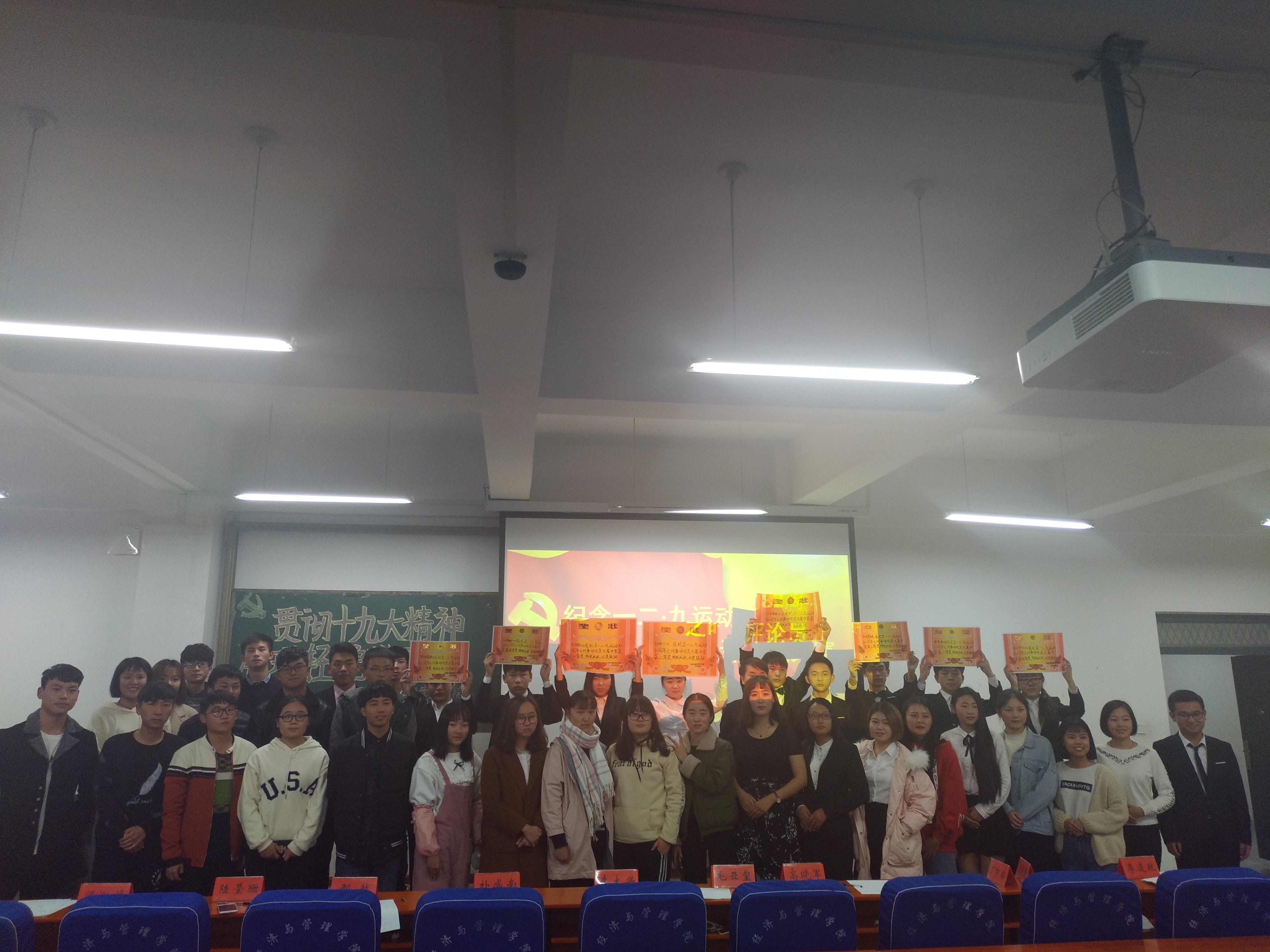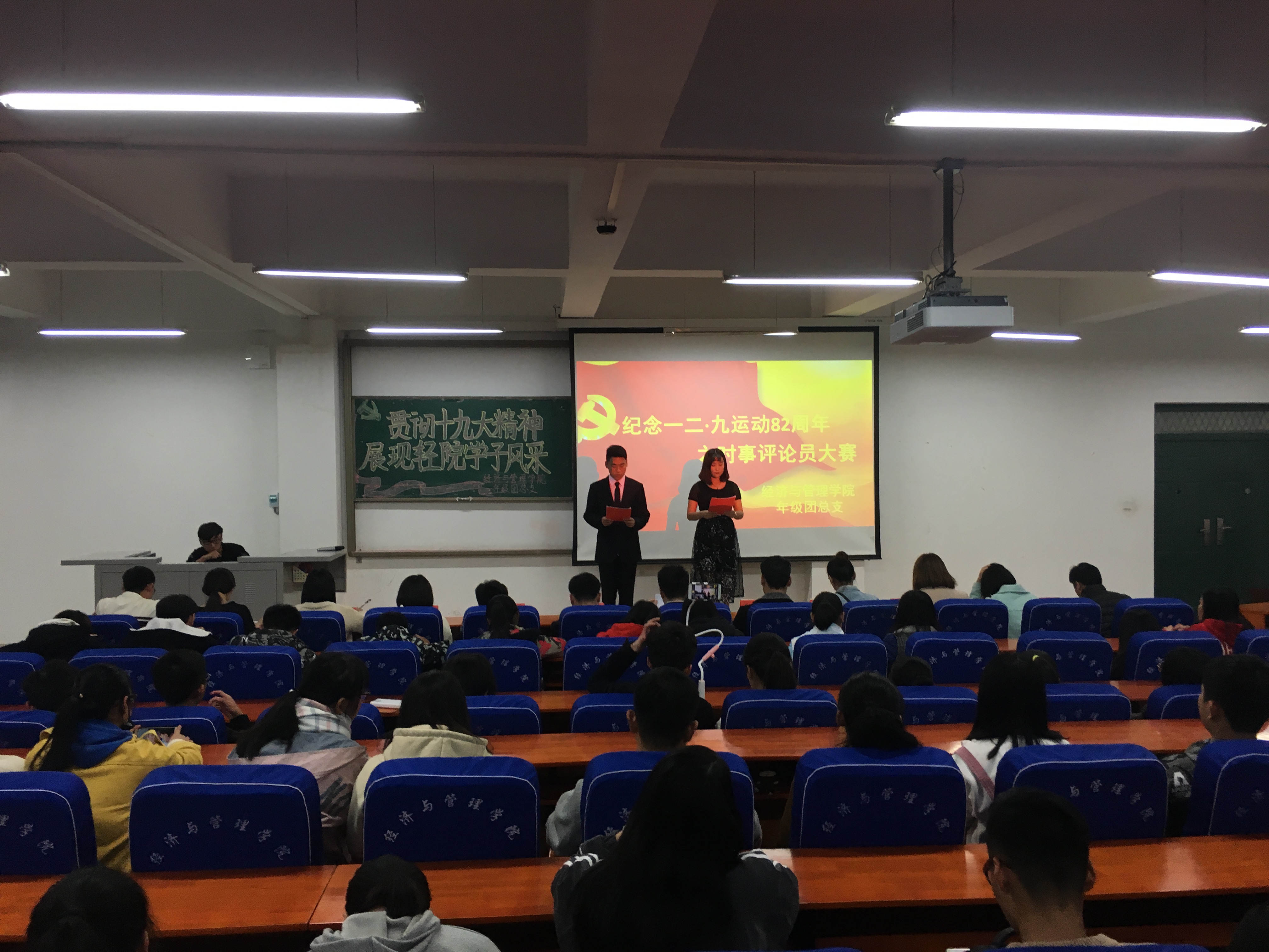 为纪念一二•九爱国运动82周年,贯彻十九大精神,展现轻院学子风采,激发同学们的爱国热情,培养青年大学生的社会责任感,2017年11月24日晚上19:30,经济与管理学院在经管楼211举办了纪念“一二•九”爱国运动82周年系列活动之学习十九大时事评论员大赛。此次活动由经济与管理学院分团委年级团总支承办,17级各班班级代表参加了此次活动。
