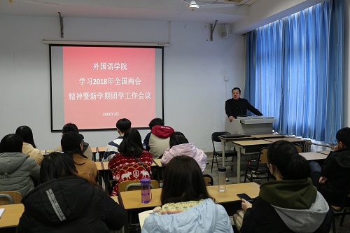 为深入贯彻落实全国两会精神,进一步提升团学工作能力,3月8日,外国语学院在东二楼409室召开学习全国两会精神暨新学期团学工作会议,分团委书记刘振卫、各年级团学骨干参加会议。