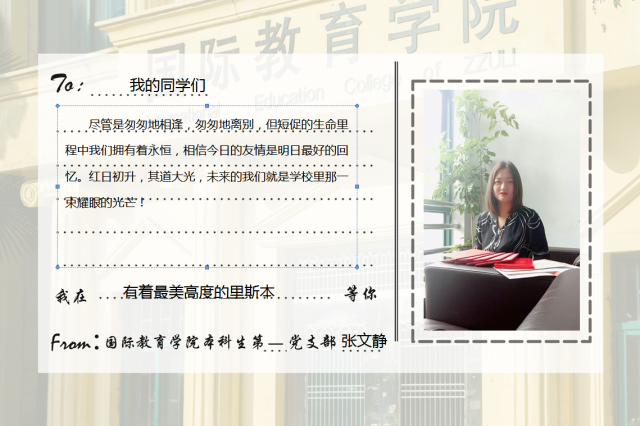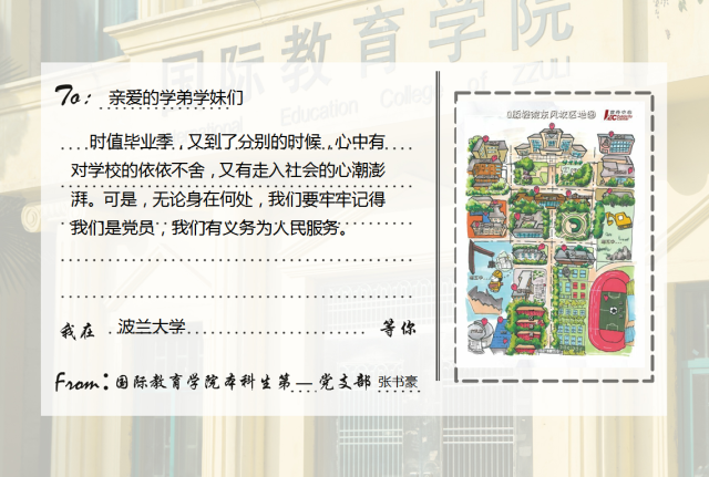 国际教育学院毕业生党员在系列离校教育活动中,铭记自己党员身份,牢记党员责任使命,承诺在未来继续发挥模范带头作用,继承和发扬“为之则易,不为则难”的校训精神,在党爱党、在党为党,不忘初心,笃志前行。