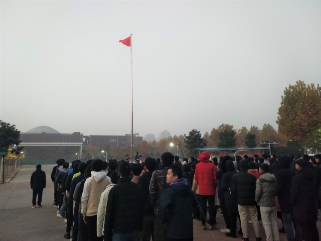 6:30分许,同学们陆续到达指定地点,在工作人员的安排下,大家有序站队,等待仪式开始。6:50,升旗仪式正式开始。国旗护卫队的成员不畏严寒、迈着整齐的步伐,迎着朝阳,护卫着五星红旗向升旗台行进。当雄壮的《义勇军进行曲》响彻广场,鲜艳的五星红旗迎着朝阳徐徐上升,全场向国旗行注目礼。