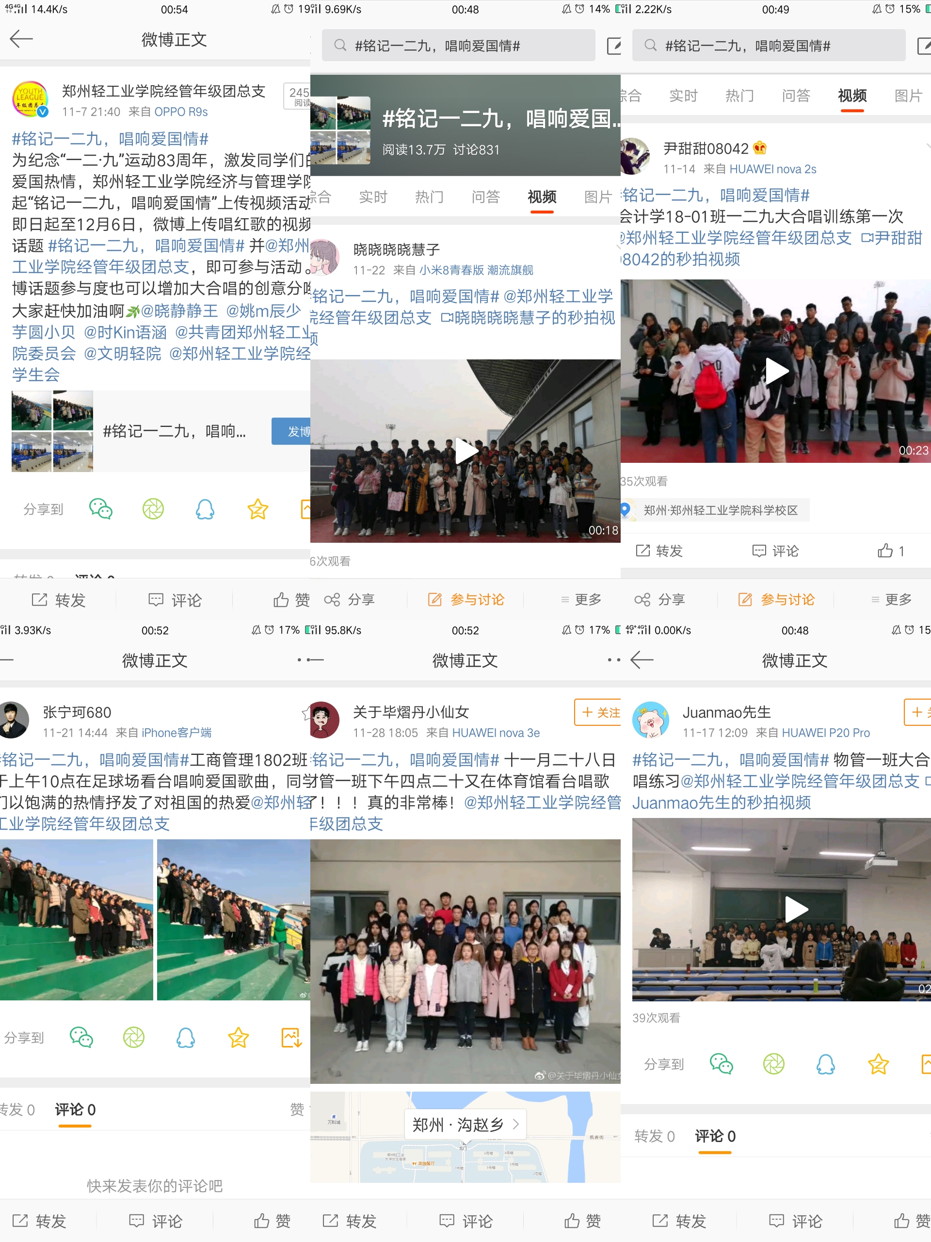 随着网络信息时代的到来,当代大学生对网络的利用率越来越高,微信和微博成为了大家交流的窗口,为了让同学们铭记一二·九的历史意义,通过唱响爱国歌曲来抒发自己的爱国情,经济与管理学院发起了“铭记一二九,唱响爱国情”上传红歌视频活动。活动内容为上传本班唱爱国歌曲的视频发送微博带话题#铭记一二九,唱响爱国情#并@郑州轻工业学院经管年级团总支,即可参与活动。活动开始后,同学们积极参与,热情互动,踊跃上传了本班练习大合唱的视频和精彩照片。