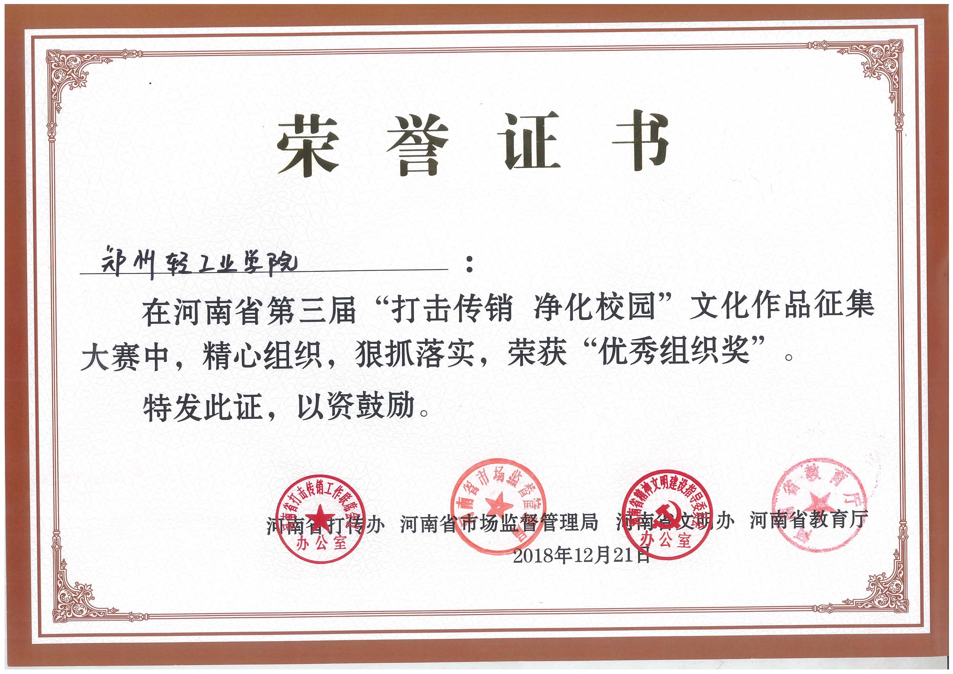日前,河南省教育厅、河南省精神文明建设指导委员会办公室、河南省打击传销工作联席会议办公室、河南省市场监督管理局联合发布了《关于公布第三届“打击传销 净化校园”文化作品征集评选结果的通知》(豫打传办[2018]9号),我校师生在此次活动中表现突出,杜明明老师指导、李宇欣同学作品《传销奇谈》荣获“视频类”二等奖,司丽娜老师指导、孙慧颖同学作品《铁拳》荣获“绘画类”二等奖,杨阳老师指导、张志远同学作品《机智的逃脱》荣获“文学类”三等奖;我校荣获优秀组织奖。