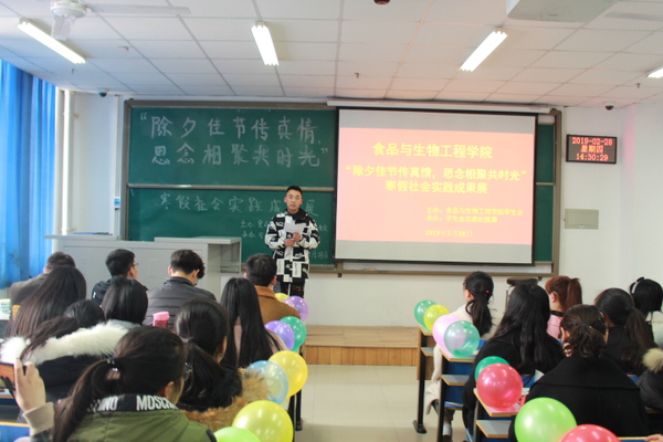 为深入挖掘中华优秀传统文化蕴含的思想观念、人文精神,继承和弘扬中华优秀传统文化,提升大学生对传统文化的认同感和自豪感,食品与生物工程学院(烟草科学与工程学院)于2019年2月28日下午在二教810举办了以“除夕佳节传真情,寒假归来话实践”主题团日活动,我院2017、2018级学生和辅导员老师参加了此次活动。
