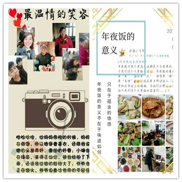 此次社会实践围绕“年夜饭的亲情佐料”,用H5页面或小视频展示独具地方特色的年俗年味和春节团聚的幸福画面,主要包含了三个方面:一是“年货大采购”,记录同亲人一起采购年货的过程,包括赶大集准备年夜饭所需要食材,在生活细节中与父母增进彼此的感情,体味团圆的幸福感;二是“亲人的笑容”,记录新春佳节亲人团聚时的温馨笑容和热情祝福,在暖暖的亲情中感受家庭的幸福,在尊老孝亲的时刻传承中华优秀传统文化;三是“共度年夜饭”,与亲人一起品味精心烹调的一份份精美地方菜,在一盘盘香气四溢的美味佳肴前共诉团聚心声,表达着真挚的美好祝愿,传递着新年来临时的喜悦,共同迎接新春佳节的到来。此次社会实践共有400多名学生参与,提交了H5页面278份、微视频122份,每份作品中都能感受到同学们在辞旧迎新中,与家人分享的憧憬和期待。学生代表们的分享也让参与活动的同学们感到了浓浓的年味和家庭的幸福。