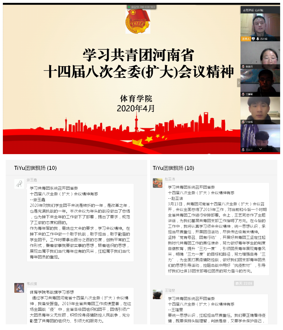 为深入学习共青团河南省十四届八次全委(扩大)会议精神, 进一步提高政治站位、统一思想认识、切实扛起新时代共青团员责任使命, 4月7日,体育学院以视频会议的形式,组织广大团学干部认真学习共青团河南省十四届八次全委(扩大)会议精神。