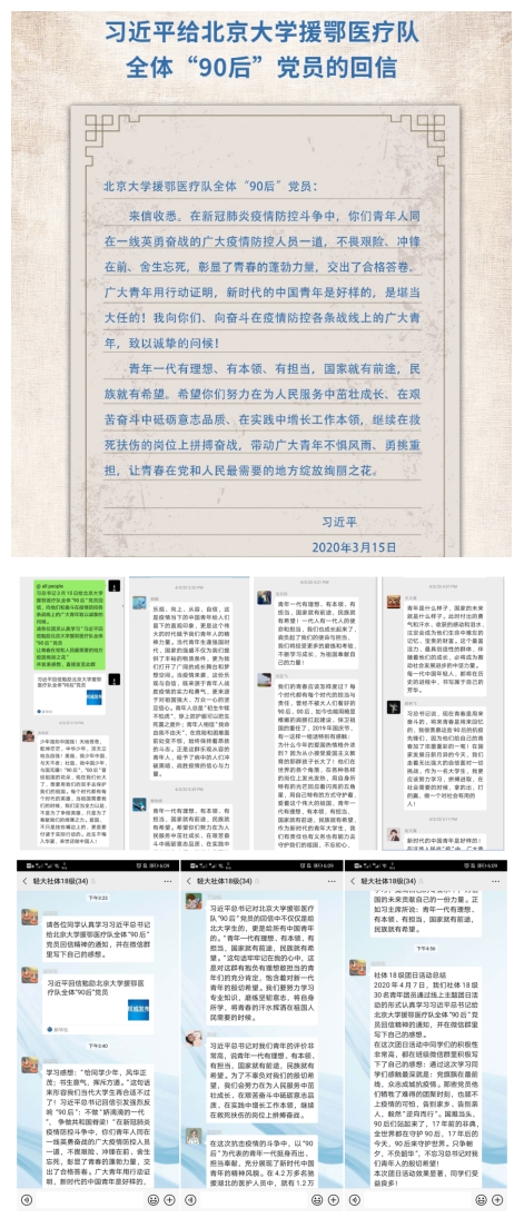 习近平总书记在回信中指出:在新冠肺炎疫情防控斗争中,你们青年人同在一线英勇奋战的广大疫情防控人员一道,不畏艰险、冲锋在前、舍生忘死,彰显了青春的蓬勃力量,交出了合格答卷,广大青年用行动证明新时代的中国青年是好样的,是堪当大任的。习近平总书记的回信即是谆谆嘱托,也是鞭策激励,使广大团员青年深受鼓舞。大家纷纷表示,要牢记习近平总书记的殷切希望,自觉树立和践行社会主义核心价值观,以孜孜不倦的理论学习滋养理想信念,用脚踏实地的实践练就过硬本领、锤炼品格修为,用实际行动证明青年一代是有理想、有担当的一代。