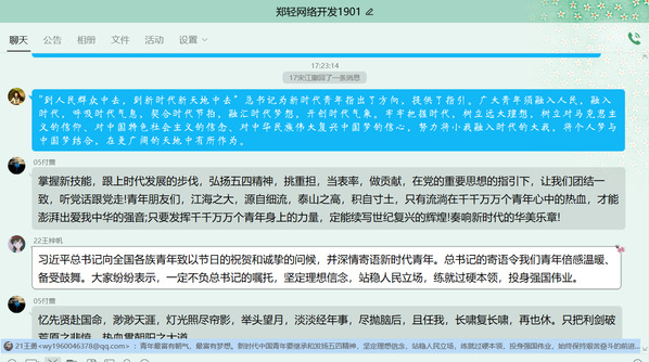 五四精神的核心是爱国主义,习近平总书记寄语广大青年要坚定信念, 练就过硬本领,鼓舞广大青年要在奋勇搏击中放飞青春梦想。同时,习近平总书记还充分肯定了青年一代在抗击疫情中展现出的精神风貌和担当作为, 并对当代青年成长成才提出了殷切期望。在此次活动中,各团支部积极参与学习,召开主题班会,通过线上PPT宣讲、视频等形式,学习了习近平总书记的五四寄语和青年学生投身疫情防控的先进事迹,并一起分享了学习感悟。同学们在学习中表示,一定会谨记习近平总书记嘱托,继承和发扬五四精神,坚定理想信念,投身强国伟业,为实现中华民族伟大复兴中国梦而努力奋斗。