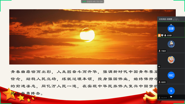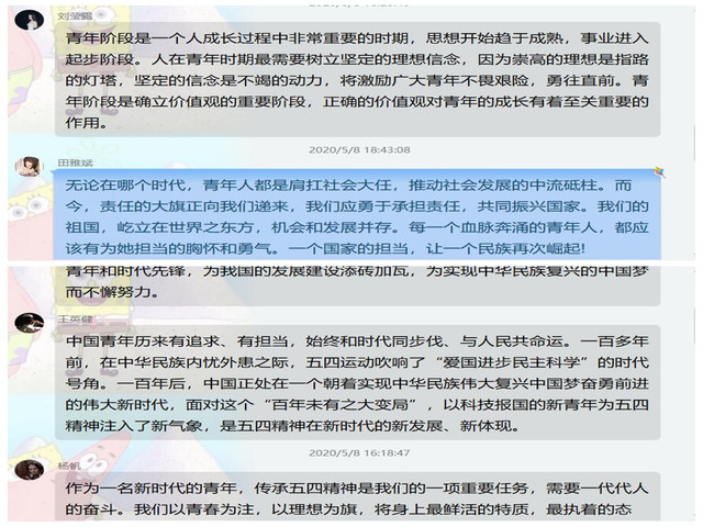 各班级团支部通过QQ、微信等线上平台,深入学习了习近平总书记五四寄语精神。习近平总书记强调,新时代中国青年要继承和发扬五四精神,坚定理想信念,站稳人民立场,练就过硬本领,投身强国伟业,始终保持艰苦奋斗的前进姿态,同亿万人民一道,在实现中华民族伟大复兴中国梦的新长征路上奋勇搏击。广大团员青年深刻领会习近平总书记对当代青年的殷切希望,纷纷表示,绝不辜负习近平总书记期望,努力奋斗,奋力拼搏,为实现中华民族伟大复兴奉献青春力量。