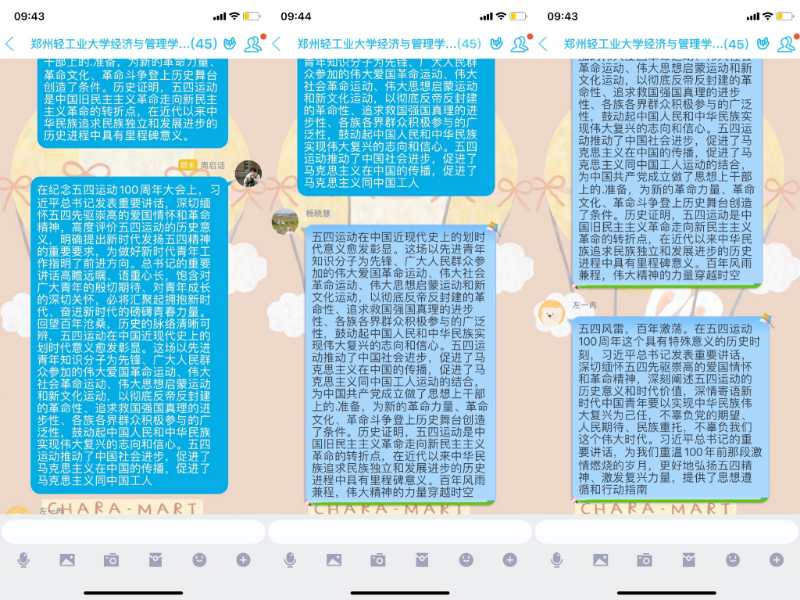 本次团日活动组织各班团支部通过线上平台,深入学习了习近平总书记五四寄语精神。习近平总书记寄语新时代青年:“青春由磨砺而出彩,人生因奋斗而升华。”面对突如其来的新冠肺炎疫情,全国各族青年积极响应党的号召,踊跃投身疫情防控人民战争、总体战、阻击战,不畏艰险、冲锋在前、真情奉献,展现了当代中国青年的担当精神,赢得了党和人民高度赞誉。通过对习近平总书记五四寄语的精神学习与领悟,同学们深刻意识到作为新时代中国青年肩上的使命和责任担当,纷纷表示要继续传承和发扬五四精神,坚定理想信念、练就过硬本领、投身强国伟业、始终保持艰苦奋斗的前进姿态。