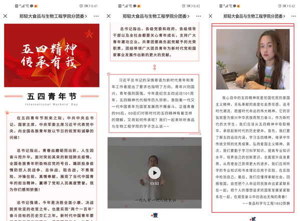 本次活动以线上形式进行。首先,各团支部组织全体团员通过团日活动或主题团课等形式,深入学习了习近平总书记对新时代青年的寄语精神,引导学生传承五四精神,勇担时代使命。之后,学院开展“学习寄语精神,展现青春担当”微作品征集活动,引导青年团员通过拍摄视频或文字的方式深入阐述了各自对新时代五四精神内涵的理解与体会,表达爱国力行的决心。同学们精心准备,积极参与,不论是对那些抗战时期挺身而出的爱国青年的缅怀与敬畏,还是对那些在疫情防控中有所作为的新时代青年的肯定与赞美,或是对那些积极投身脱贫攻坚、乡村振兴的实干青年的钦佩与歌颂……同学们各抒己见,表达了各自对弘扬新时代五四精神的独到见解,大家纷纷表示要牢记习近平总书记的嘱托,坚定理想信念,站稳人民立场,练就过硬本领,投身强国伟业,为实现中华民族伟大复兴的中国梦而努力奋斗,以青春之我创建青春之中国。最后,优秀作品在我院微信公众平台展出,此次活动圆满结束。