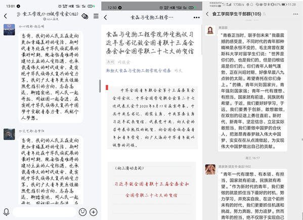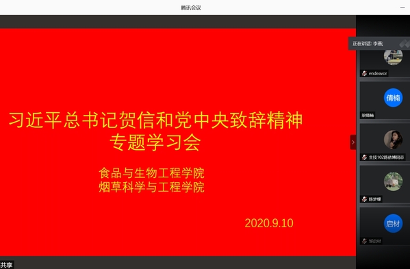 为深入学习贯彻习近平总书记致全国青联十三届全委会和全国学联二十七大的贺信精神以及党中央的致辞精神,9月9日-10日,食品与生物工程学院(烟草科学与工程学院)分别在线上和线下分批次进行了集中学习,学院全体本科、研究生班级以及学生会主要学生干部参与学习。