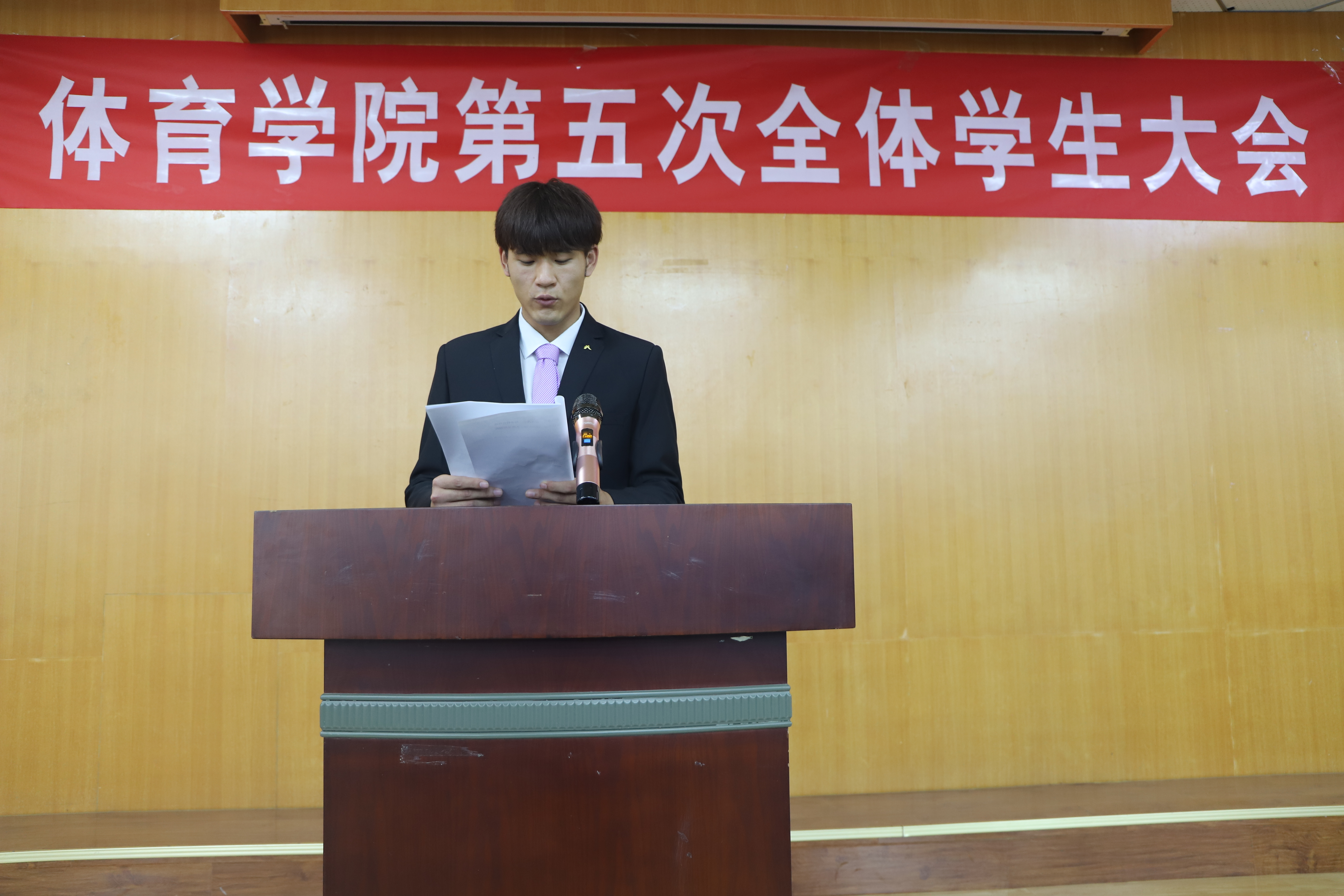 校学生会主席团成员吴苏霖同学代表校学生会向大会致辞。他对体育学院第五次全体学生大会的顺利召开表示了祝贺,对体育学院学生会近一年来取得的成绩给予了充分肯定。同时,他希望体育学院学生会以饱满的热情和高度的责任感投身到接下来的各项工作中,凝心聚力,团结奋进,努力开创学生会工作新局面。