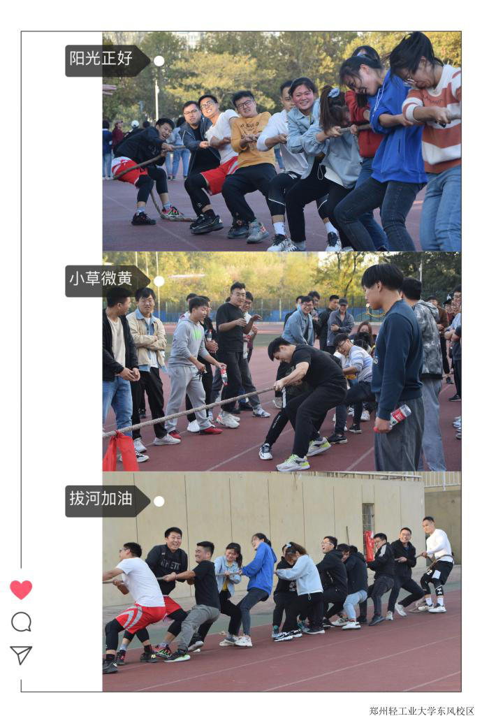 11月8日下午,郑州轻工业大学研究生会组织的趣味运动会在两校区操场上火热进行。本着“树立健康第一”的理念,15个学院的广大研究生积极参与了本次运动会,共计40余支参赛队伍。