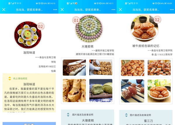 此次比赛历时近一个月,共分为图片类、视频类、征文类和网上知识竞赛四个部分,要求参赛成员以各地特色传统美食为基础,深入挖掘当地食品文化及与美食相关的历史故事、传统典故,讲述传统美食的文化内涵,历史渊源,特色创意,时代特征等。网上知识竞赛以中国传统美食知识设置相关五百多道题目,每次随机生成五十题,共计300余人参与竞赛,评选出一等奖三名、二等奖五名、三等奖十三名。视频类,图片类与征文类共同评奖,共收到作品100余份,大赛评委通过作品与主题的相关度,原创性,宣传效果等进行综合评定,分别评选出《桥上情缘一“线”牵》等一等奖两名、《被牛皮纸包装的记忆》等二等奖四名、《有“饵”,有料》等三等奖六名。这些优秀创意作品都充分展示了各地特色传统美食的特色创意,时代特征及蕴含的传统典故,让同学们深刻感受到了中华美食文化的魅力。