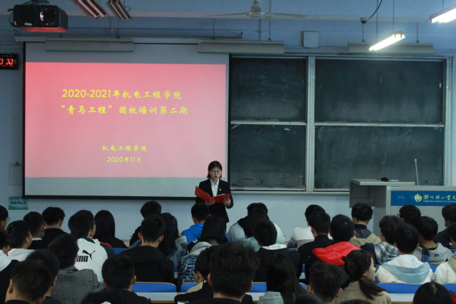为全面学习贯彻党的十九届五中全会精神,踏上实现“十四五”规划和2035年远景目标的新征程,2020年11月22日下午,机电工程学院在东一楼200举办以“走进‵十四五′,青春正当时”为主题的团课培训。2019级和2020级全体班长和团支书、学院青马工程学员参加此次团课。