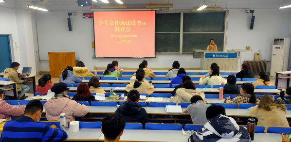 为进一步贯彻落实《关于落实共青团和学联对高校学生会(研究生会)指导管理责任的若干规定(试行)》和《关于学联学生会工作人员改进作风服务同学的若干规定》文件精神,12月7日19:00,数学与信息科学学院学生会作风建设警示教育会在东一楼218教室召开。会议由学院团委书记张智勤主持,全体学生组织工作人员参加。