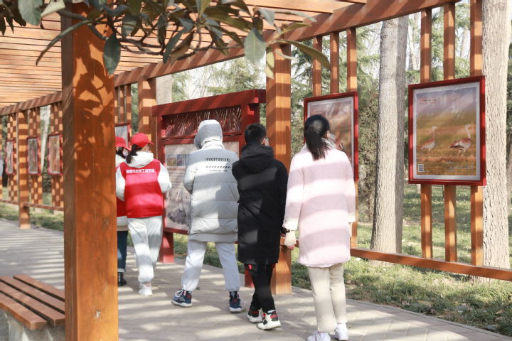 随后,成员们来到郑州黄河国家湿地公园。进入园区,成员们在文化长廊前放慢脚步仔细阅读学习。黄河不仅养育了生灵,更承载了中国传统文化,黄河生态无法得到有效保护,我们将再也无法欣赏到壮丽的黄河风光,依黄河而生的各种动物生存问题也会受黄河生态环境的直接影响,修复黄河生态刻不容缓。参观途中,成员们发现一处走廊因水土流失而坍塌于黄河中,形成对比的是种植树木的地方,那里土质坚硬很难形成水土流失。后来经过询问工作人员得知,坍塌的地方还未来得及种植树木进行生态修复,成员们直观感受到了黄河生态修复的重要性。之后,参与成员便开始了力所能及的保护黄河行动,分区域捡游客丢弃的垃圾,向游客宣传有关保护黄河的小知识,帮助工作人员维护公园公共设施。在志愿者们的努力下,园区内的卫生情况明显得到改善,不文明行为也有所减少。最后,全体成员在黄河湿地公园门前合影留念。