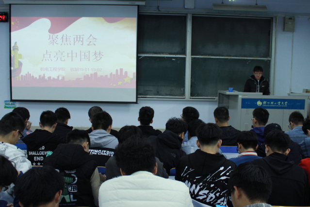 为深入学习习近平新时代中国特色社会主义思想,贯彻落实2021年“两会”精神,进一步统一思想和行动,凝聚青春力量,强化责任担当,机电工程学院于3月21日在东一楼200举办 “聚焦两会热点,聆听时代声音”主题团日活动,2019级全体学生参加了此次活动。