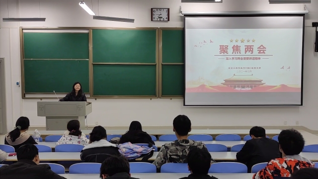 各班级团支部通过观看“两会”开幕式、PPT讲解、学习研讨等方式了解“两会”内容,学习“两会”精神,并围绕教育、就业、创业、抗疫等问题谈认识、说感想,进行热烈讨论。他们或是以寝室为单位,推出各位代表展示他们的学习成果,分享他们对“两会”精神的认识与感悟;或是集体朗读入团誓词,使同学们重温入团的初心和使命;或是通过观看视频,重点学习探讨“两会”中的教育问题及创业问题;或是针对两会关键词“健康中国”,讲述疫情防控取得的重大成果及先进人物,引起同学们强烈的共鸣与讨论。大家纷纷表示,要时刻关注国家发展,把握社会动向,以习近平新时代中国特色社会主义思想为指引,树立远大理想,学习文化知识,提高实践能力,努力成长为担当民族复兴大任的时代新人。