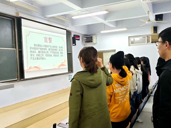 会议开始,主持人首先播放了团中央宣传片《新时代我们来了!》,向同学们讲解了会议的主要内容和精神;团员代表们以朗诵的形式歌颂共青团,生动地表达出对会议精神的理解和学习;之后主持人向同学们介绍了轻大杰出校友陈淑杰,同学们从她的视频中感受到了蓬勃的朝气和永不言败的信念,获益匪浅。紧接着主持人邀请2018级学长分享作为寒假志愿者的心得体会,同学们写下在这次活动中学到的精神以及对未来的展望。在王婕同学的带领下,所有同学起立庄严宣誓,将现场氛围推向高潮。