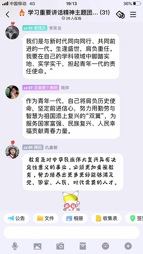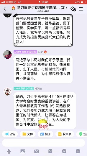 各团支部组织团员观看《新闻联播》相关视频,采取线上线下相结合的形式,在团员青年中开展集中学习,营造了“学党史、强信念、跟党走”的浓厚氛围。优秀团员代表踊跃交流发言,结合自身成长发展经历,畅谈学习收获和体会,分享学习习近平总书记重要讲话对自己成长发展的意义和收获。习近平总书记高度重视青年学生成长发展,在时代定位上,习近平总书记强调:“当代中国青年是与新时代同向同行、共同前进的一代,生逢盛世,肩负重任。”在群体特点上,习近平总书记指出:“当代青年思想活跃、思维敏捷,观念新颖、兴趣广泛,探索未知劲头足,接受新生事物快,主体意识、参与意识强。”在为人为学上,习近平总书记殷切期望“树立为祖国为人民永久奋斗、赤诚奉献的坚定理想”“如饥似渴、孜孜不倦学习,既多读有字之书,也多读无字之书,注重学习人生经验和社会知识”“坚持德智体美劳全面发展”。