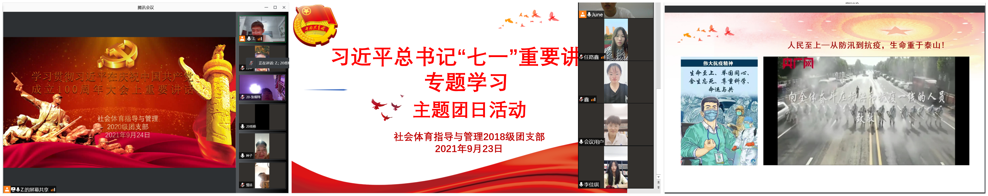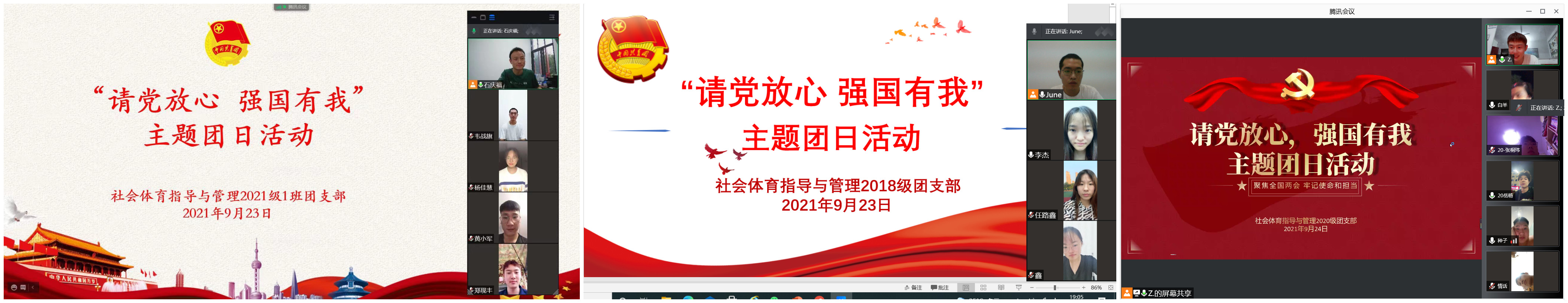 为深入学习领会习近平总书记在庆祝中国共产党成立100周年大会上的重要讲话精神,凝聚青春力量,弘扬抗疫精神,近日,体育学院各基层团支部在线上开展“请党放心,强国有我”主题团日活动。