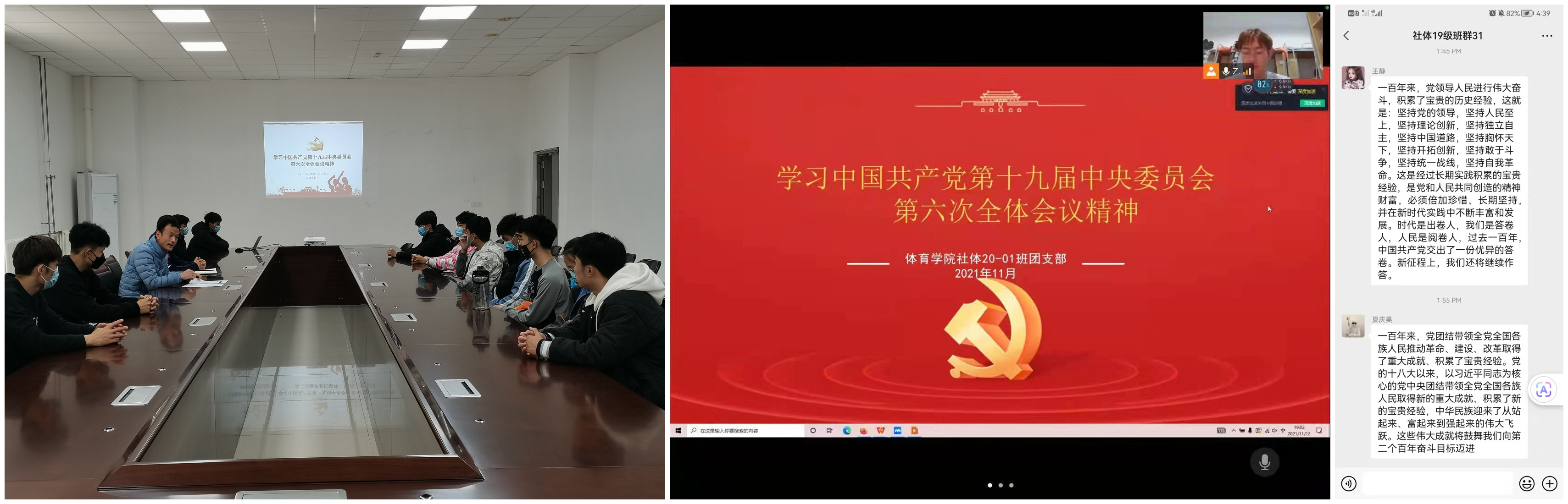 11月8日至11日,中国共产党第十九届中央委员会第六次全体会议在北京召开。全会听取和讨论了习近平总书记受中央政治局委托作的工作报告,充分肯定党的十九届五中全会以来中央政治局的工作,审议通过了《中共中央关于党的百年奋斗重大成就和历史经验的决议》,审议通过了《关于召开党的第二十次全国代表大会的决议》。习近平总书记就《中共中央关于党的百年奋斗重大成就和历史经验的决议(讨论稿)》向全会作了说明。大会召开会,为做好学习宣传贯彻会议精神,提高全院团员青年的思想政治素养,发挥团支部的战斗堡垒作用,体育学院各班级团支部积极组织开展了形式多样的主题团日活动,学习会议精神。