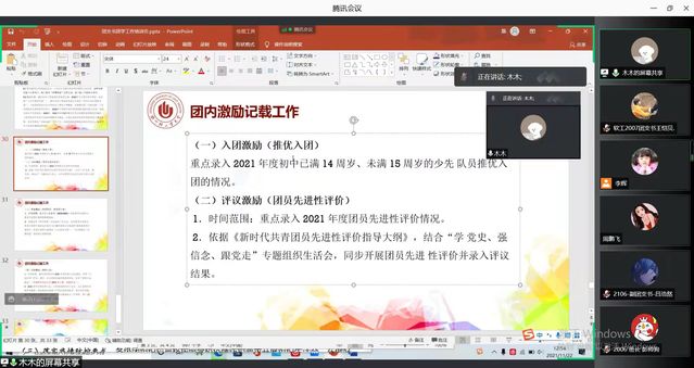 首先,学院团委组织委员李鹏博同学就近期团学主要工作和相关规范操作流程向大家进行讲解。针对近期“团支部对标定级”、“学习党十九届六中全会精神”、“学党史,强信念,跟党走”专题组织生活会、团日活动开展、团内激励记载等内容带领大家详细学习了相关文件并解读文件要求,提醒各团支部及时开展各类团学活动,严格规范工作手册填写、智慧团建录入等,一方面加深团学干部对团务工作深入认识,另一方面推动团学工作顺利开展。