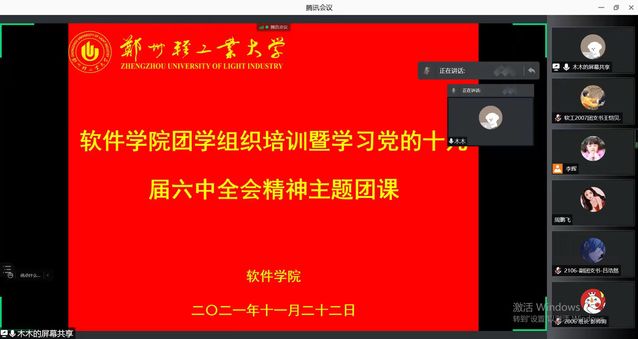 为进一步贯彻落实校团委工作要求,加强学院团学组织建设、提升团学干部理论素养,软件学院于11月19日和11月22日分别针对新生团干和全体团学干部开展了团学组织培训暨学习党的十九届六中全会精神主题团课活动。学院团委书记李辉、辅导员刘琳老师以及各年级、班级团干参加了本次会议,会议分别采用线下和线上方式举行。