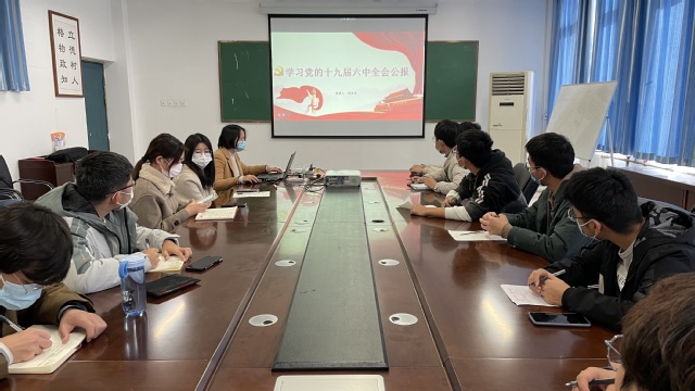团课上,周老师对十九届六中全会精神进行了全面领学,详细解读了了十九届六中全会公报内容,全会听取和讨论了习近平受中央政治局委托作的工作报告,审议通过了《中共中央关于党的百年奋斗重大成就和历史经验的决议》,全面总结了党的百年奋斗重大成就和历史经验,深刻回答了“过去我们为什么能成功,未来我们怎样才能成功”的重要问题,为实现中华民族伟大复兴指明了前进方向、提供了行动指南、擘画了宏伟蓝图。周老师号召同学们认真学习公报内容,深刻领会十九届六中全会精神的丰富内涵,进一步强化思想建设,补足精神之钙、把稳思想之舵。