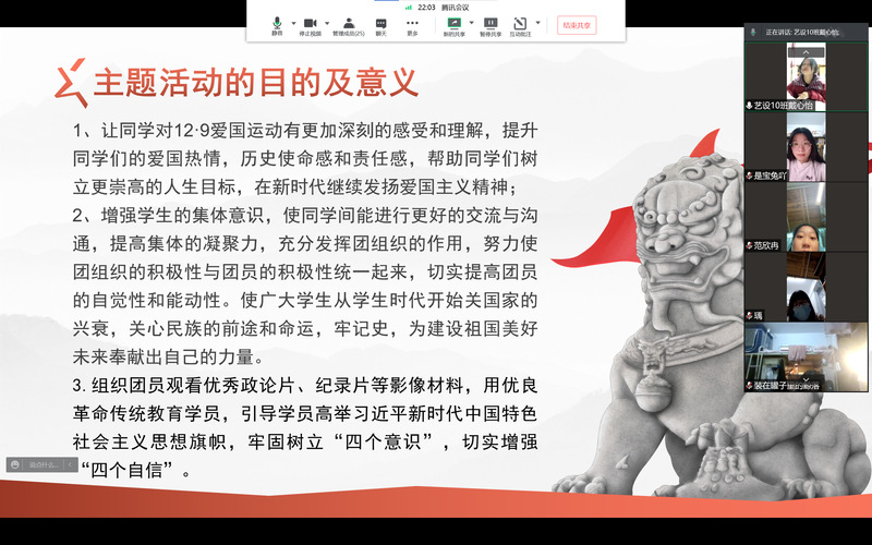 为纪念“一二·九”运动86周年,进一步弘扬革命精神,筑牢理想信念之基,12月9日前后,艺术设计学院以团支部为单位开展了“重温革命历史,纪念‘一二·九’运动86周年”主题团日活动。学院全体团员青年共1200余人参与了本次活动。
