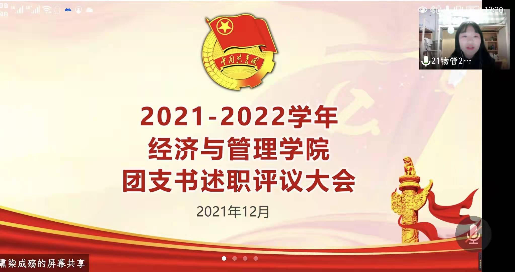 为学习贯彻党的十九届六中全会精神,推动全面从严治团走深走实,全面检验各团支部年度基层团务工作开展情况,及时了解团组织书记履职情况,进一步查找问题、总结经验、交流方法、激发活力,从而推进我院基层团组织规范化、科学化、信息化水平建设。经济与管理学院于12月9日至12月10日期间召开了2021-2022学年第一学期团支书述职大会,我院2018、2019、2020级基层团支部书记于12月9日在经管楼211室召开会议,2021级本科生于12月10日通过腾讯会议参与线上述职。