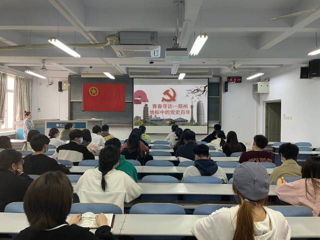 本次青马班课程在共青团团歌《光荣啊,中国共青团》中开始。随后,赵老师以《青春寻访-郑州红色地标的百年党史》为题,立体生动地介绍了烙印在郑州的红色印记。不忘初心-百年德化、打倒列强-碧沙岗、精神永存-豫西抗日纪念馆,赵老师重点讲解了郑州早期革命探索的历程,让同学们在这些身边的红色历史地标中感受党的百年奋斗史,勉励同学们积极投身实践,勇于探索,奋力争先,做一名合格的新时代青年。