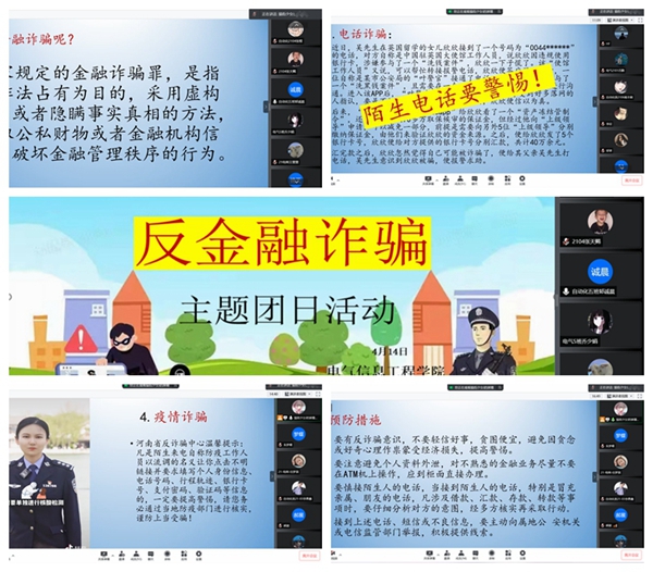 4月13-15日,电气信息工程学院开展校园金融安全宣传教育主题团日活动。各团支部发放金融宣传教育手册,播放金融宣传教育宣传片,签订《承诺书》,进一步增强同学们对金融安全知识的认识以及预防网络诈骗的警觉性,确保教育全覆盖。