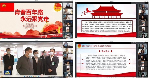 继承优良传统,赓续红色血脉。为迎接党的二十大胜利召开,庆祝中国共产主义青年团成立100周年,深入学习贯彻习近平新时代中国特色社会主义思想,弘扬和传承五四精神,2022年5月4日,外国语学院各支部以线上形式开展“青春百年路,永远跟党走”主题团日活动。