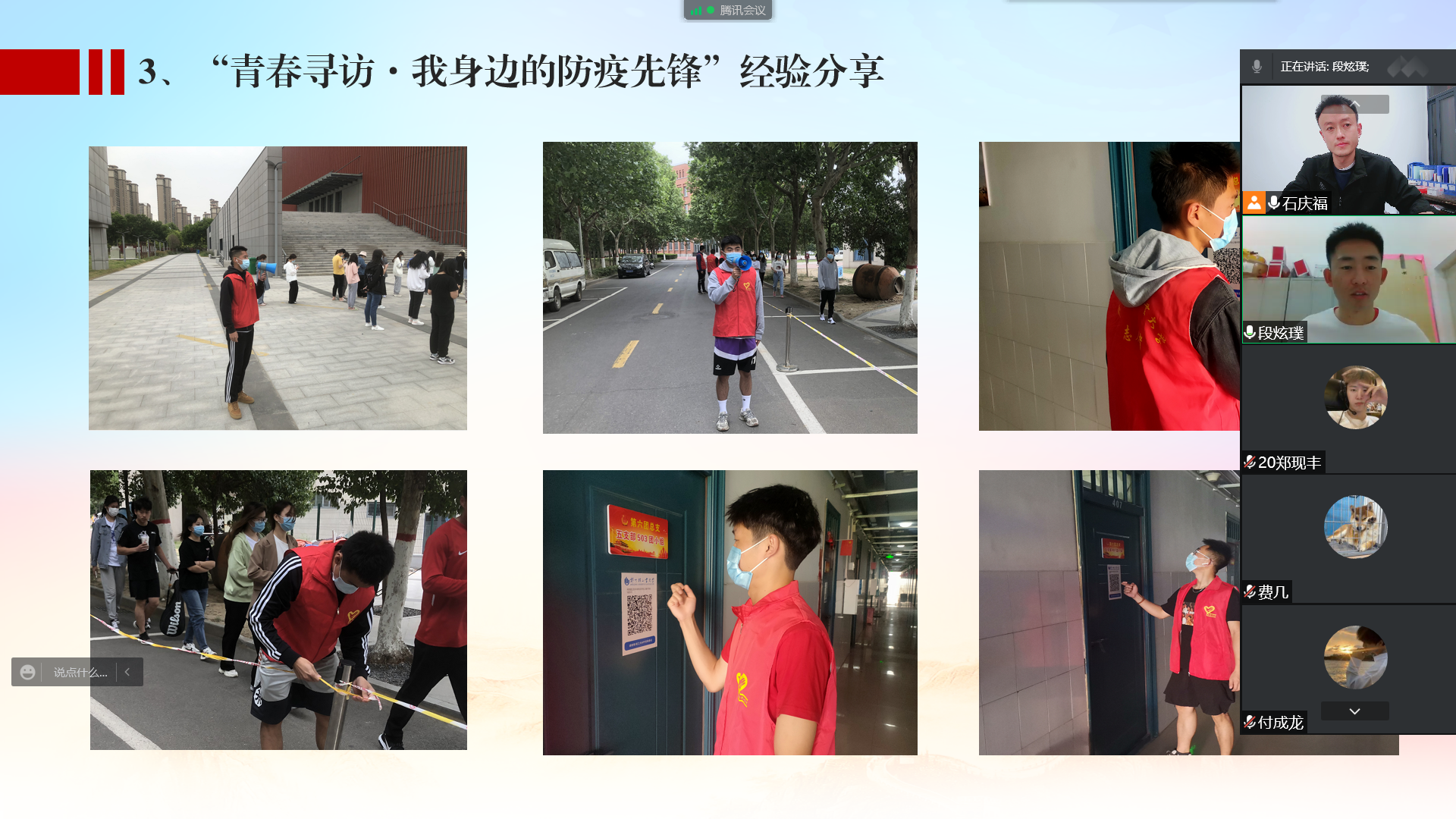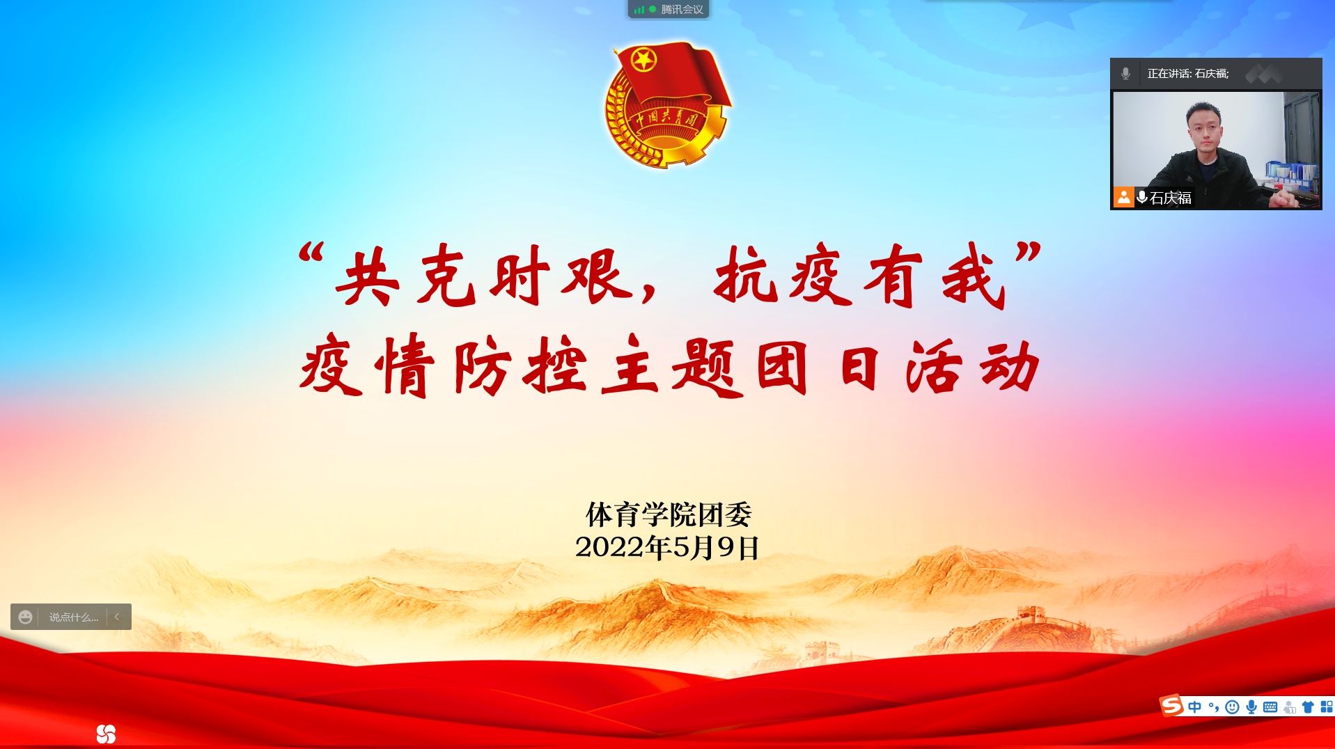 为加深广大团员青年对疫情防控形势政策的认识和理解,5月9日晚,体育学院在线上开展了“共克时艰,抗疫有我”疫情防控主题团日活动。体育学院全体团员青年参加了此次活动。活动由体育学院团委书记石庆福老师主持。