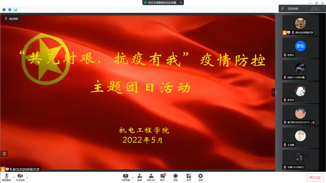为深入贯彻落实习近平总书记关于疫情防控工作的重要讲话精神,充分发挥团组织的生力军和突击队作用,积极配合疫情防控工作,5月6日至16日,机电工程学院组织开展了“共克时艰,抗疫有我”疫情防控主题团日活动。学院全体团员青年参加了本次活动。