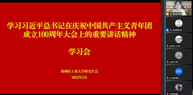 5月19日,我校研究生会组织学习习近平总书记在庆祝中国共产主义青年团成立100周年大会上的重要讲话精神,学习以线上学习会形式进行。研究生会全体工作人员参会。