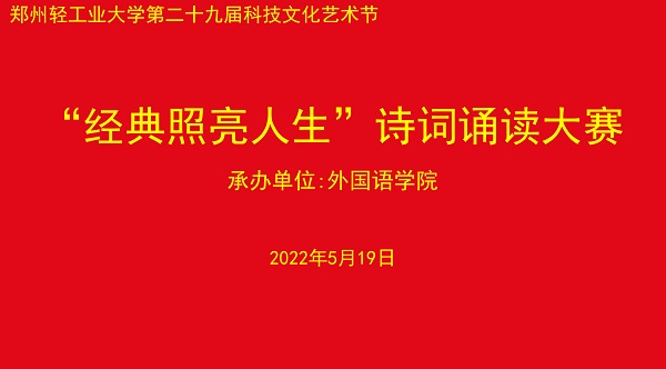 5月19日,我校第二十九届科技文化艺术节之“经典照亮人生”诗词诵读大赛在线上举行,大赛由外国语学院承办。经过初赛,来自全校的15个节目参加决赛。