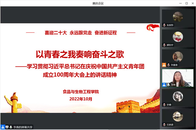 为进一步深入学习贯彻习近平总书记重要讲话精神,提高青年学生的思想理论水平和政治素质,10月5日下午,食品与生物工程学院线上开展“喜迎二十大,永远跟党走,奋进新征程”主题宣讲活动,活动由校青年讲师团成员李燕老师主讲,学院2022级全体团干和团员代表参会学习。