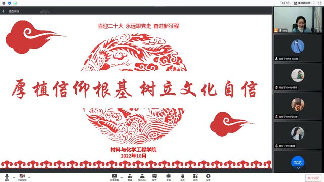 为进一步着力宣传习近平新时代中国特色社会主义思想,引导青年坚定“四个自信”、厚植对党的理想信念,10月7日,材料与化学工程学院线上开展“喜迎二十大,永远跟党走,奋进新征程”主题宣讲活动,活动由校青年讲师团成员赵梦婕老师主讲,学院2022级新生团员和学院团学骨干参会学习。
