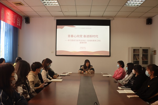矫菲老师带领与会人员认真学习了《论党的青年工作》文集。《在庆祝中国共产主义青年团成立一百周年大会上的讲话》一文,强调了“党管青年”的原则,明确了青年工作的政治属性和育人目标;《在纪念五四运动一百周年大会上的讲话》中,鲜明地提出了中国青年运动的时代主题,明确了当代青年新的使命;在《新时代青年要爱国、励志、求真、力行》中,明确了青年要立心立志的时代要求;在《广大青年成长成才要励志勤学、加强磨炼》中,要求青年要肩负远大理想,锻炼过硬本领,励志肩负起民族复兴的历史重任。矫菲老师号召广大青年学生,要牢记总书记的嘱托,坚持青春向党、志存高远,把个人追求和时代发展结合起来,为民族复兴事业奋斗终生;坚持不懈学习、锻炼本领,提高自身综合素养,把论文写在祖国的大地上;坚持敢于担当、无私奉献,主动投身于社会实践和志愿服务工作中,用所学服务社会和人民。