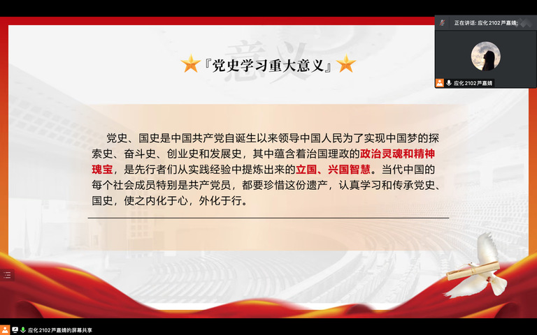 此次活动以红色革命故事简述、红色经典诗文诵读、红色经典知识抢答、个人心得体悟分享等形式一一展开。线上活动秩序井然,各团支部成员踊跃参加。在经典诗文诵读中,青年学生精神饱满,激情飞扬地朗诵了《七律长征》《可爱的中国》《坚定跟党走,奋进新时代》等红色经典诗文。经典的红色革命故事承载着丰厚、宝贵的革命精神和革命传统,红色诗文诵读讴歌了党的丰功伟绩,咏颂对党的忠诚与热爱。活动尾声,各团支部成员相继分享此次诵读活动的心得体悟。感悟红色精神,传承红色基因,与党的二十大精神相联系,学生们从百年党史、百年征程汲取奋进力量,赓续新时代的欣欣向荣。