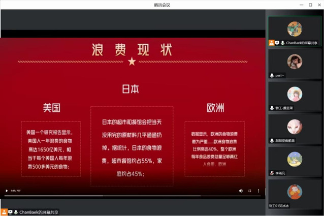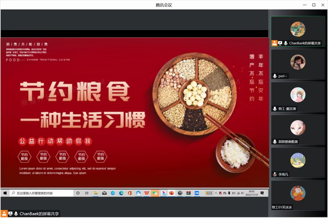 此次活动以线上形式展开,活动开始各班级团支书组织带领同学们线上观看了勤俭节约、浪费可耻的主题视频,同学们忆苦思甜,感悟一粥一饭当思来之不易,半丝半缕恒念物力维艰的精神品质。在观看后同学们踊跃发言,积极探讨如何厉行勤俭节约,共建文明校园。各班学生代表以身作则,纷纷发言表示:我们应牢固树立勤俭节约、艰苦奋斗的意识,内化于心、外化于行,主动担起青年标兵使命,以身作则带动更多人践行节俭风尚,共同养成勤俭节约、杜绝浪费的良好习惯。最后班长对此次活动进行总结,号召大家积极参加“文明校园随手拍”、“光盘行动”微分享等活动,记录并分享校园文明行为,用实际行动践行承诺。