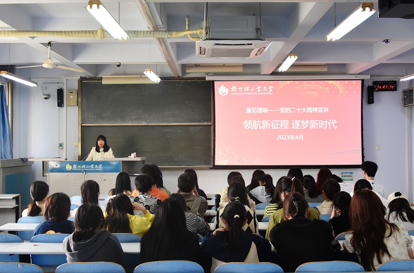 为深入学习贯彻党的二十大精神,推动党的二十大精神在广大青年中落地生根、开花结果, 4月27日中午,外国语学院在教三楼604教室开展“豫见理响——党的二十大精神”宣讲活动,本次活动由校青年讲师团成员、院团委书记矫菲主讲,院青马班学员、团学工作人员代表参加了此次活动。