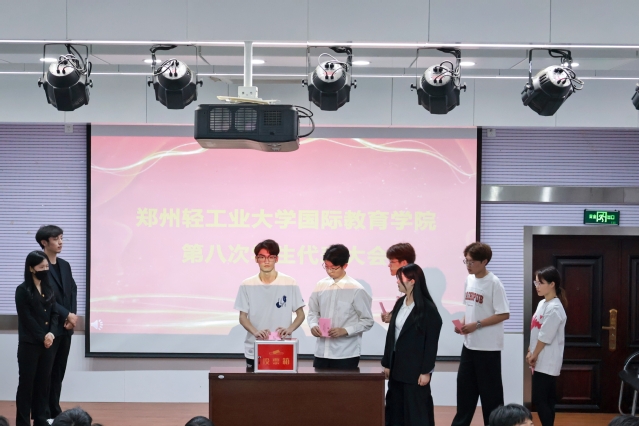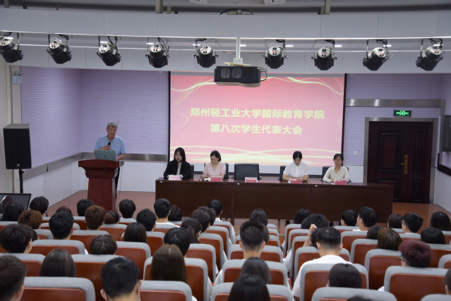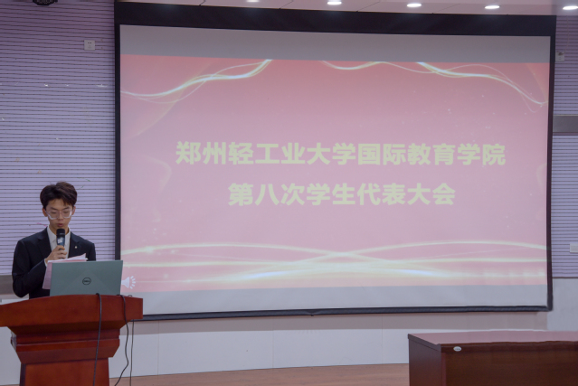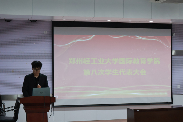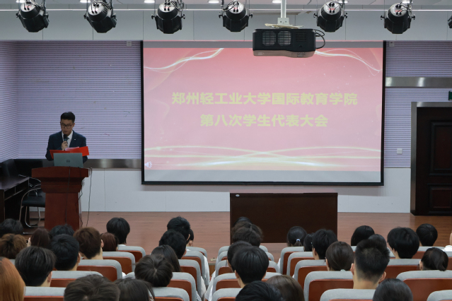 校学生会主席团代表边牧云致贺词,对大会的召开表示衷心的祝贺,对国际教育学院学生会过去一年的工作表示肯定。随后,院学生会主席团成员刘依涛代表上一届学生会做工作报告,报告从思想引领、学风建设、校园文化、社会实践等方面回顾总结了学生会的主要工作和成绩,分析了工作中存在差距和不足,明确了今后的工作目标和努力方向。会上,与会代表分别审议并通过了《郑州轻工业大学国际教育学院学生会工作报告》、《郑州轻工业大学国际教育学院学生会章程》、《郑州轻工业大学国际教育学院学生代表大会换届选举办法(草案)》,表决通过了出席郑州轻工业大学学生代表大会正式代表建议名单,选举并产生郑州轻工业大学国际教育学院新一届学生会主席团成员。最后,大会在激昂奋进的中国共产主义青年团团歌中闭幕。
