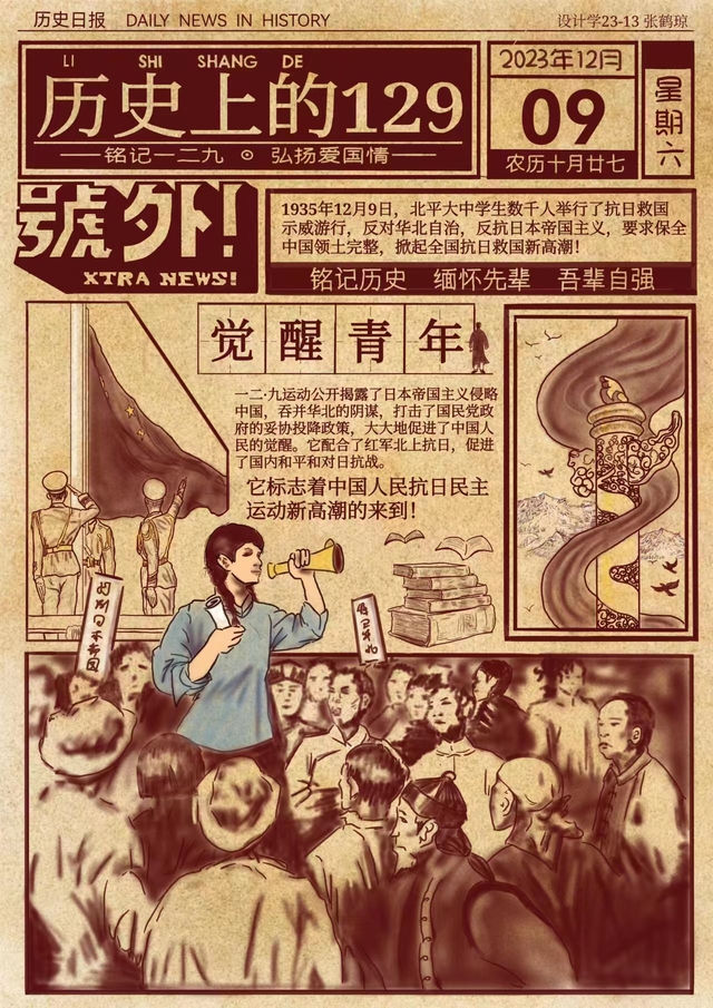 为了加强对广大团员青年的爱国主义教育,提醒同学们铭记历史,2023年11月下旬至12月上旬,艺术设计学院面向全体学生开展了纪念“一二·九”运动主题设计绘画作品征集活动。