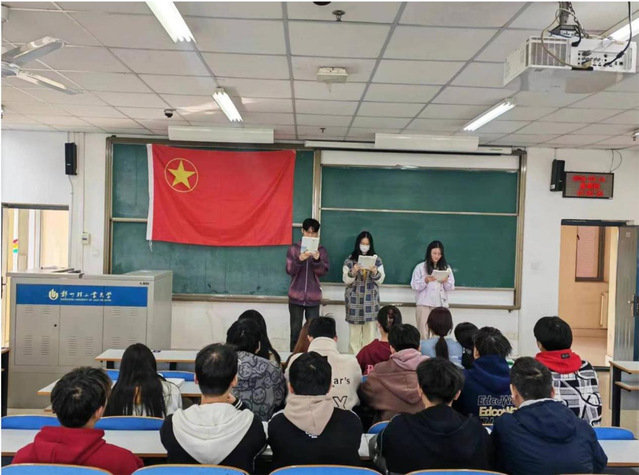 活动开始,团支书带领同学们从雷锋精神的时代内涵、具体内容、重要意义等方面进行理论知识的学习。接着组织青年学生观看雷锋精神相关影片,通过观看影片《雷锋在1959》,大家更深地领悟到雷锋精神的实践意义。然后组织了雷锋精神小剧场,同学们化身小演员,通过情景剧,演绎了三段不同场景下的雷锋精神。活动最后,三位同学为大家进行了经典诵读,情感充沛地朗读了雷锋精神金句。同学们纷纷表示,在新时代,要弘扬雷锋精神,以实际行动书写新时代雷锋故事,让青春在奉献中绽放。