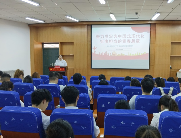 宣讲会上,栗想以“奋力书写为中国式现代化挺膺担当的青春篇章”为主题,带领同学深入学习了习近平总书记五四青年节对全国广大青年寄语精神,并围绕“新时代中国共产党的青年观”“新时代青年应当如何弘扬五四精神”“如何做担当民族复兴大任的时代新人”这三个方面,结合新时代优秀青年榜样故事和经历进行了宣讲,希望同学们能够认真领悟习近平总书记重要寄语精神的丰富内涵和实践要求,切实增强责任感和使命感,继承和发扬五四精神,在科技创新、乡村振兴、绿色发展、社会服务、卫国戍边等各领域各方面勇当排头兵和生力军,争做有理想、敢担当、能吃苦、肯奋斗的新时代好青年。
