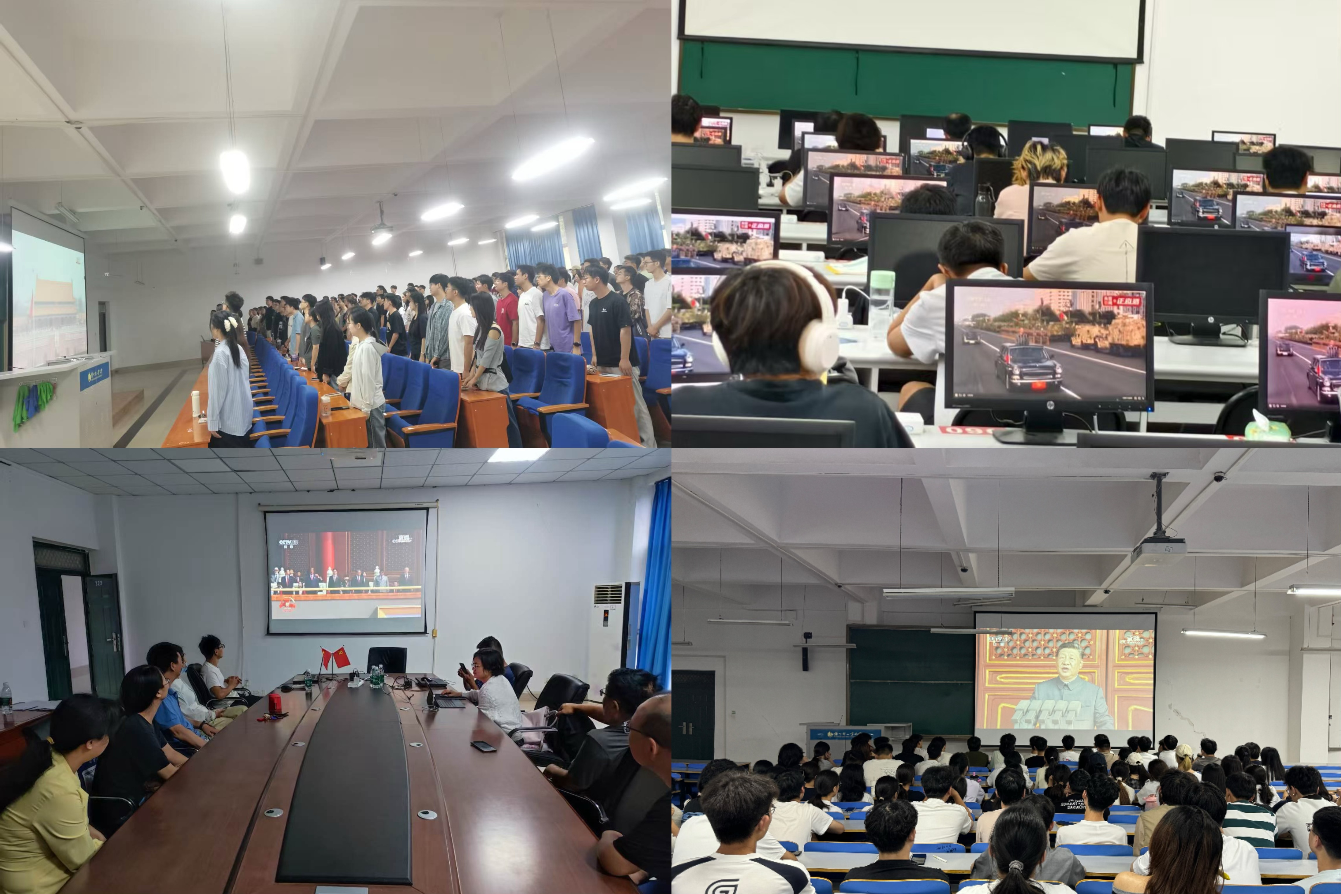 学院领导班子成员、各辅导员在213会议室集中收看,全体教师以系部为单位收看实况直播,在上课教室以及计算机楼118、217会议室为本科生、研究生同步直播纪念中国人民抗日战争暨世界反法西斯战争胜利80周年大会。上午9时,学院师生端坐在会议室和教室中,认真聆听习近平总书记的重要讲话,深刻领会中国人民抗日战争暨世界反法西斯战争胜利的重大历史意义和现实意义。当阅兵仪式开始,看到整齐划一的受阅部队、先进精良的武器装备时,全体人员热血沸腾,倍感自豪。